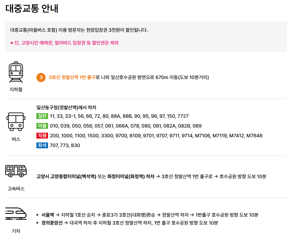고양꽃박람회는 차 없는 박람회를 지향합니다. 대중교통 이용 시 현장 구매 티켓 3천 원 할인 혜택도 있어요!