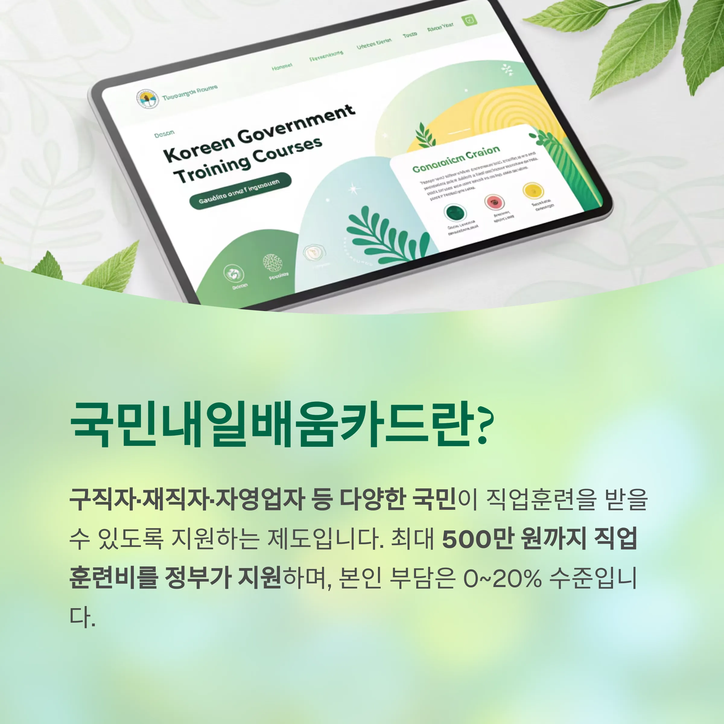 카드를 발급받으면 최대 500만 원까지 직업훈련비를 정부가 지원하며, 본인 부담은 0~20% 수준입니다.