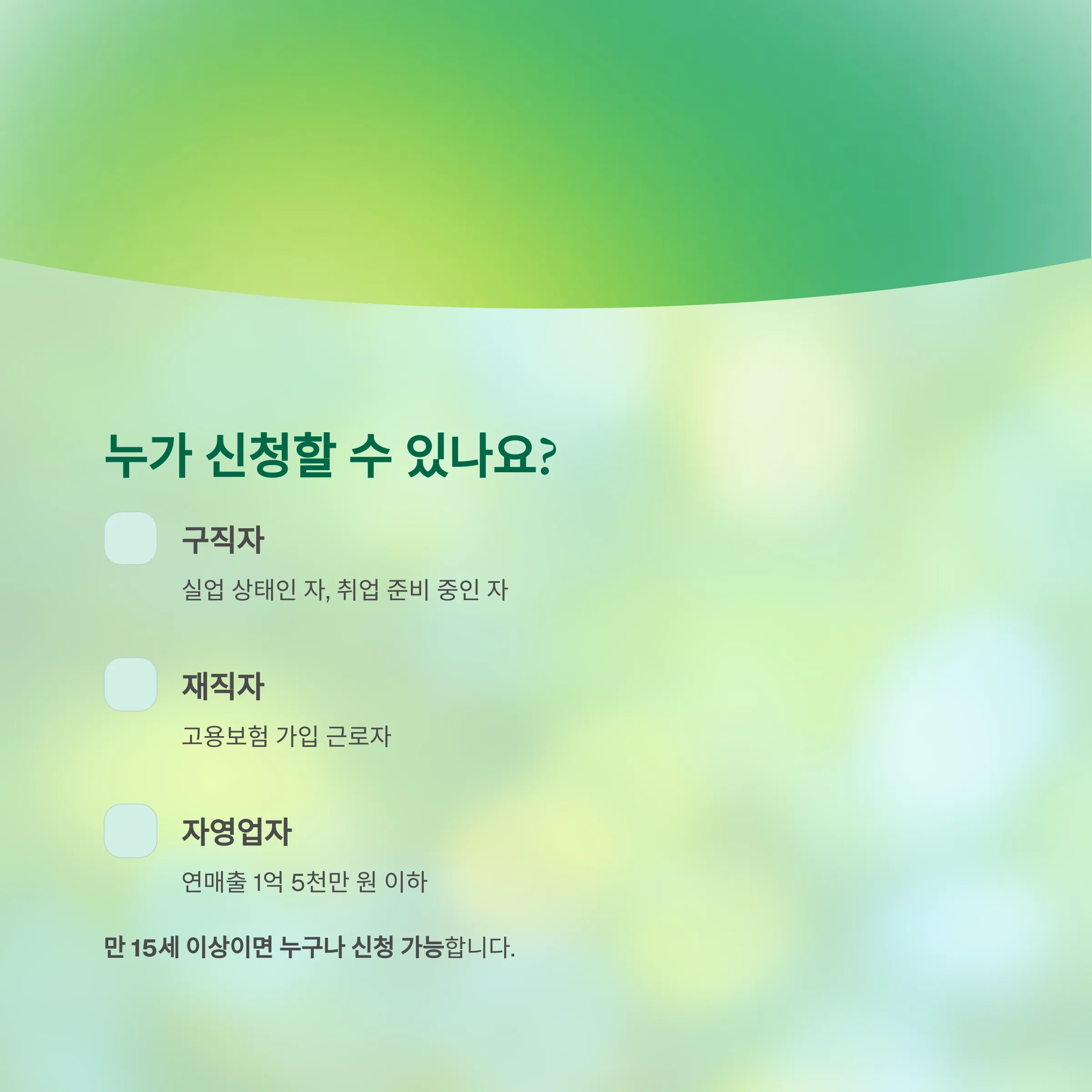 또한 만 15세 이상이면 누구나 신청 가능하며, 대학 재학생도 일부 조건에서 신청 가능합니다.