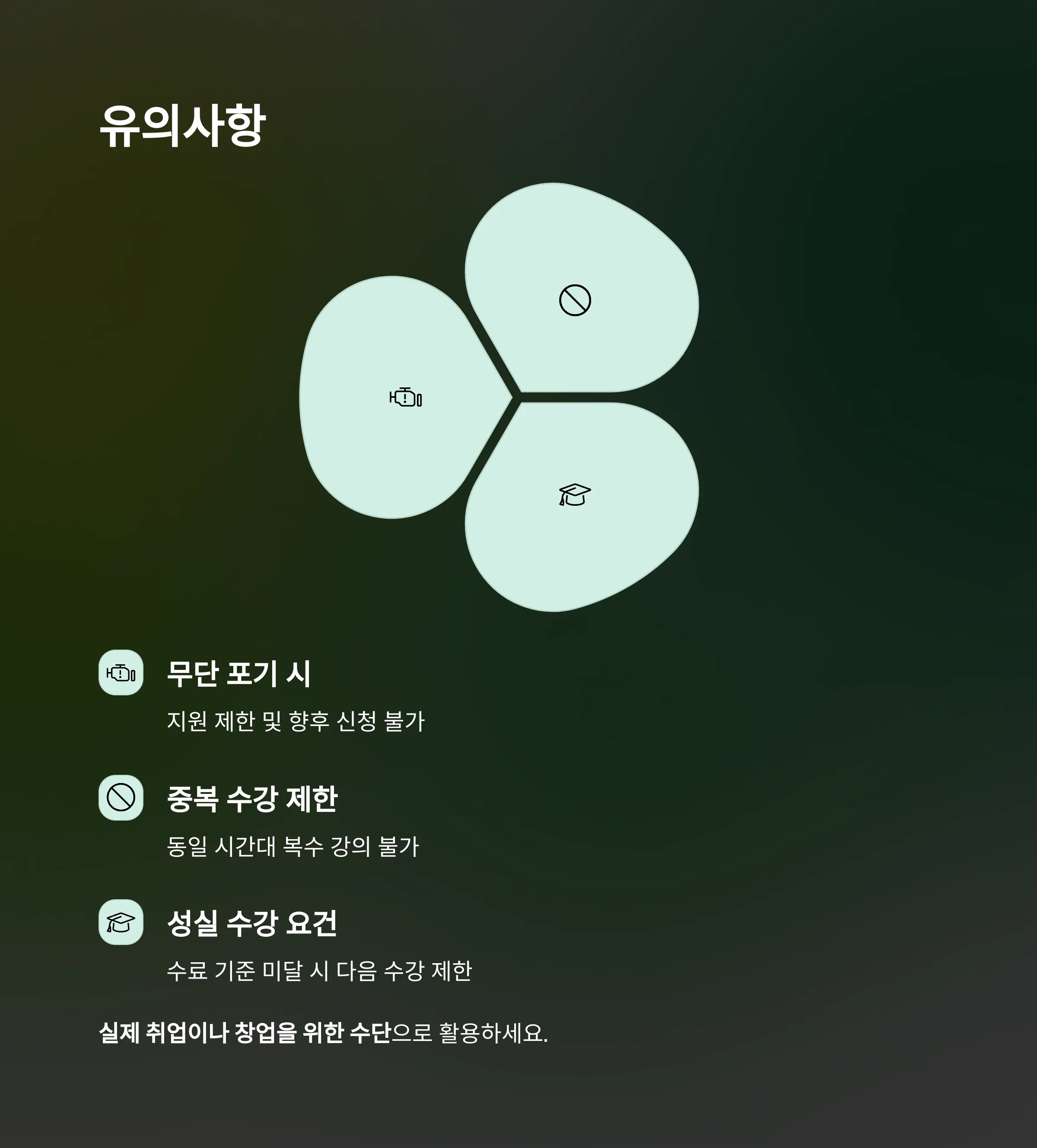 | 성실 수강 요건 | 수료 기준 미달 시 다음 수강 제한 |