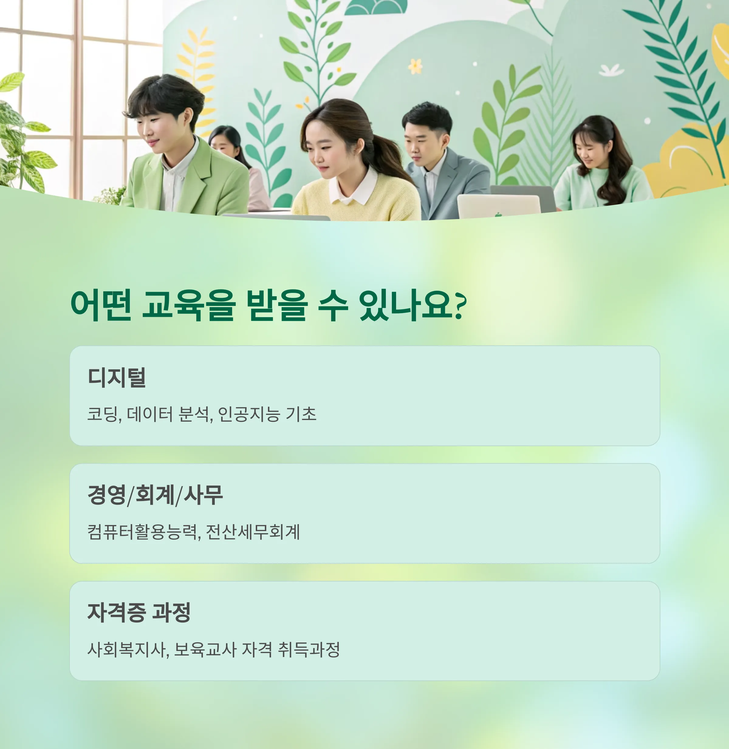 2025년에는 디지털, AI, 물류, 간호조무, 제과제빵 등 실용 과정이 대폭 확대되었습니다.