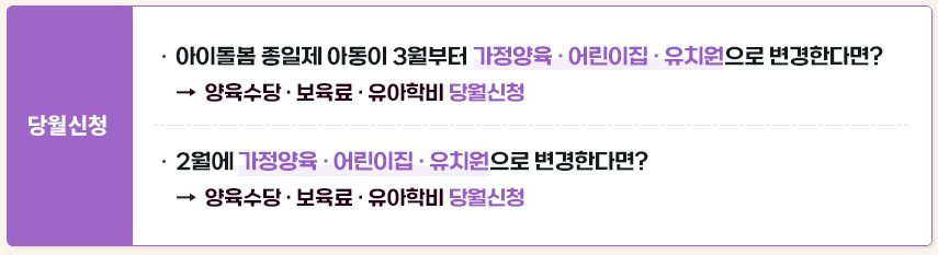 3월 1일 기준으로 영유아 보육 서비스를 새로 이용하거나 보육 자격 변경이 필요한 아동이 대상입니다. 예를 들어: