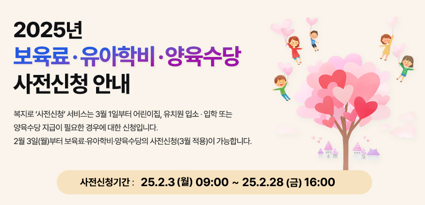 안녕하세요, 부모님 여러분! 😊 2025년 새 학기를 맞아 영유아 보육서비스인 보육료, 유아학비, 양육수당의 사전신청이 시작되었습니다.