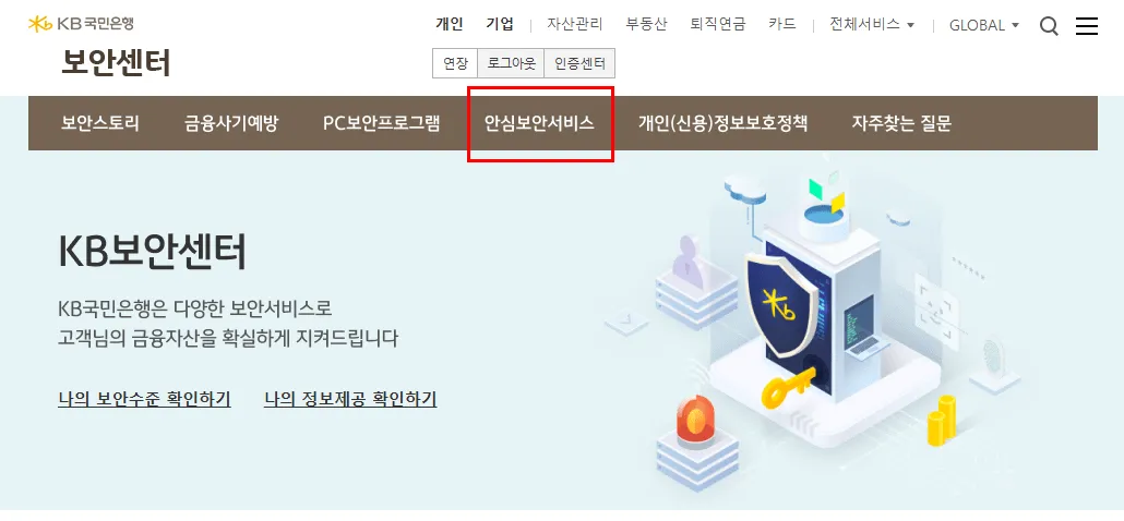 KB국민은행 인터넷뱅킹 로그인 → 보안센터 → 안심보안서비스 → 금융거래 안심차단 서비스 → 여신거래 안심차단 신청