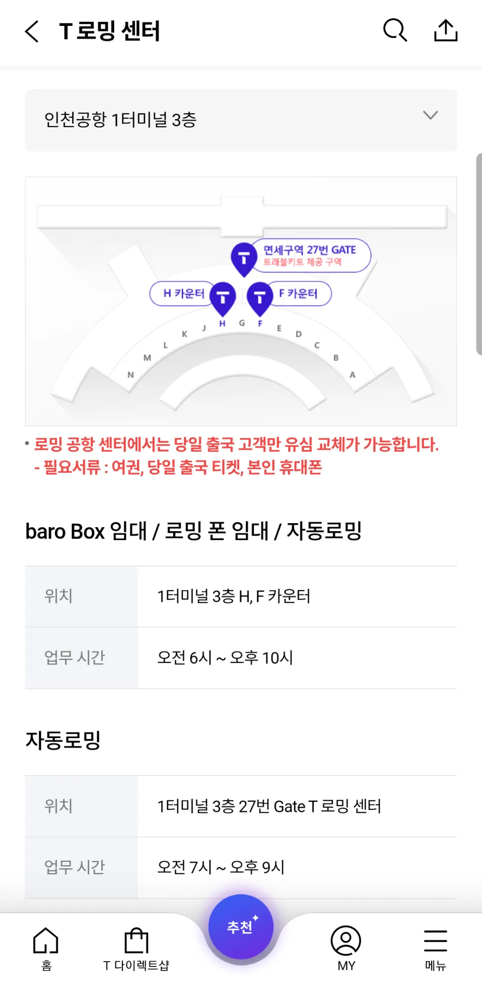 인천공항 제1터미널 기준, 유심 교체 장소는 다음과 같습니다.