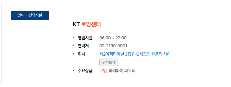- 1층 로밍센터: 13번 출구 앞(24시간), 2번 출구 앞(06:00~)